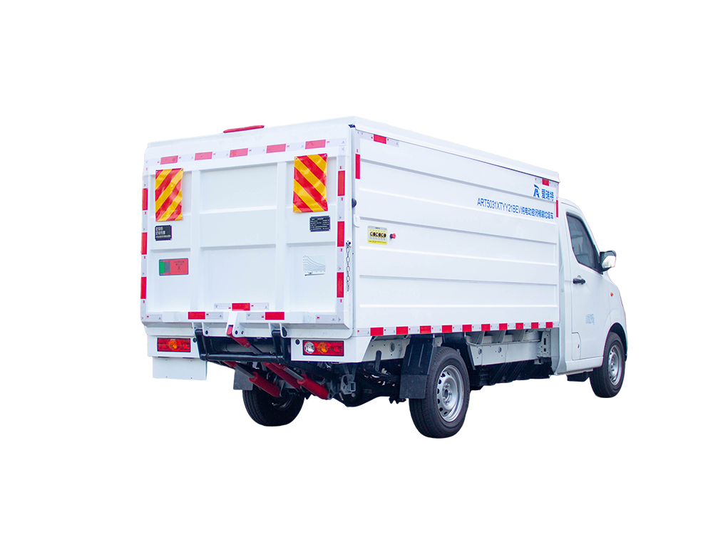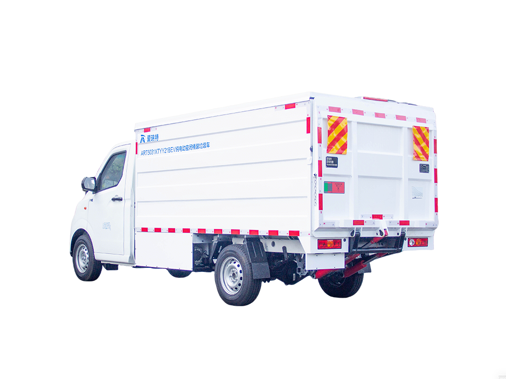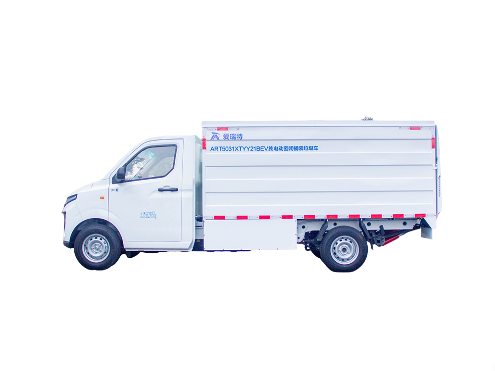 ART5031XTYY21BEV純電動密閉式桶裝垃圾車是一種擁有密封式垃圾箱采用液壓尾板升降機構收運垃圾桶的垃圾桶駁運車,適用于收運放置于城市生活小區或街道兩側的標準塑料垃圾桶(240L/660L)。