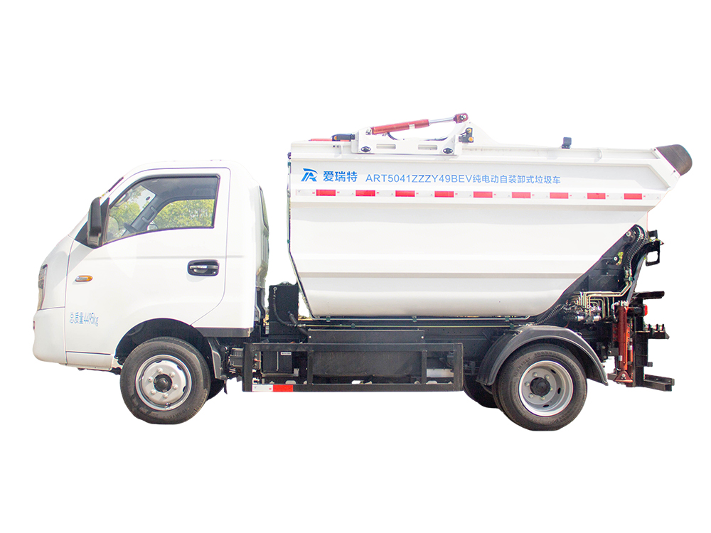 ART5041ZZZY49BEV純電動自裝卸式垃圾車采用后置翻桶機構上料,高位傾翻垃圾箱卸料的生活垃圾收運車,能夠同時滿足兩個標準垃圾桶同時上料,?作業效率極高,?適合城市小區、主次干道和沿街標準垃圾桶的收運,同時可以與大型純電動壓縮式垃圾車進行車車對接。