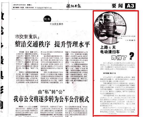 濮陽(yáng)環(huán)衛(wèi)局購(gòu)買的10臺(tái)“愛瑞特”牌清掃車上路清掃,登上濮陽(yáng)日?qǐng)?bào)頭版及濮陽(yáng)電視臺(tái)新聞