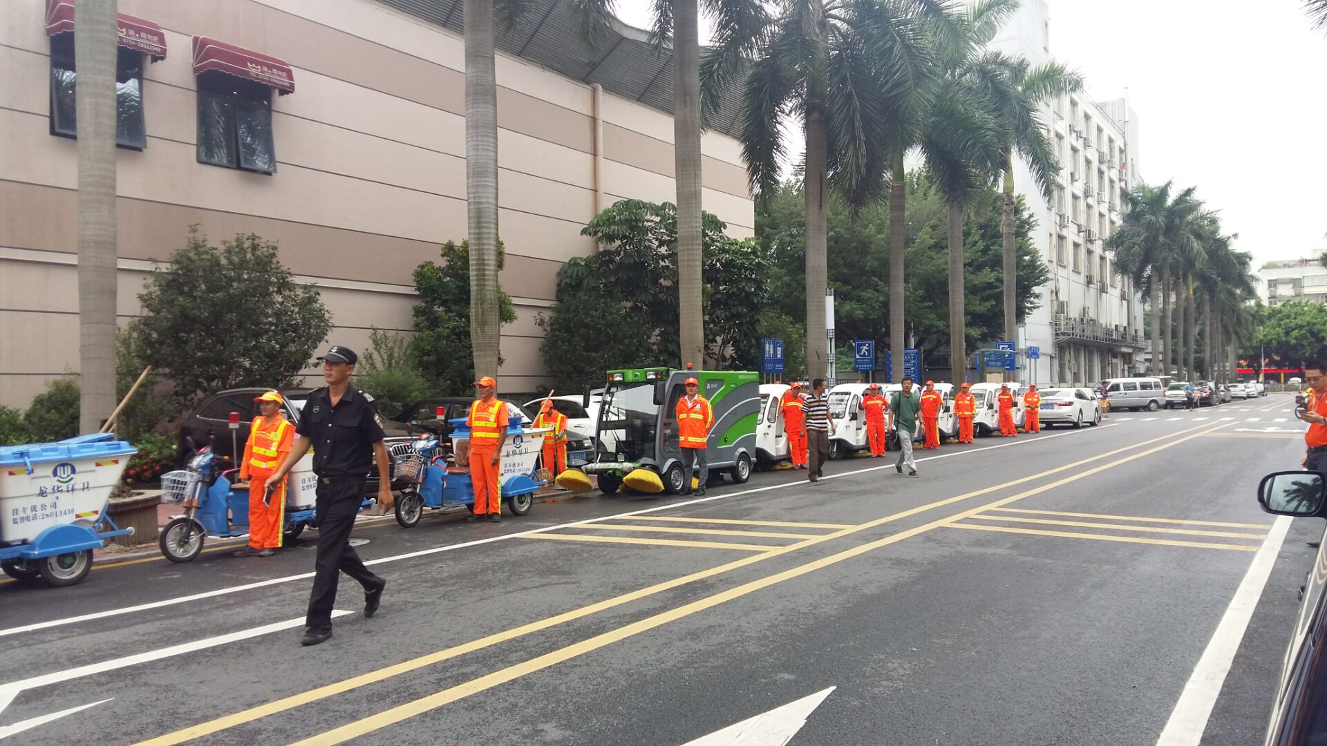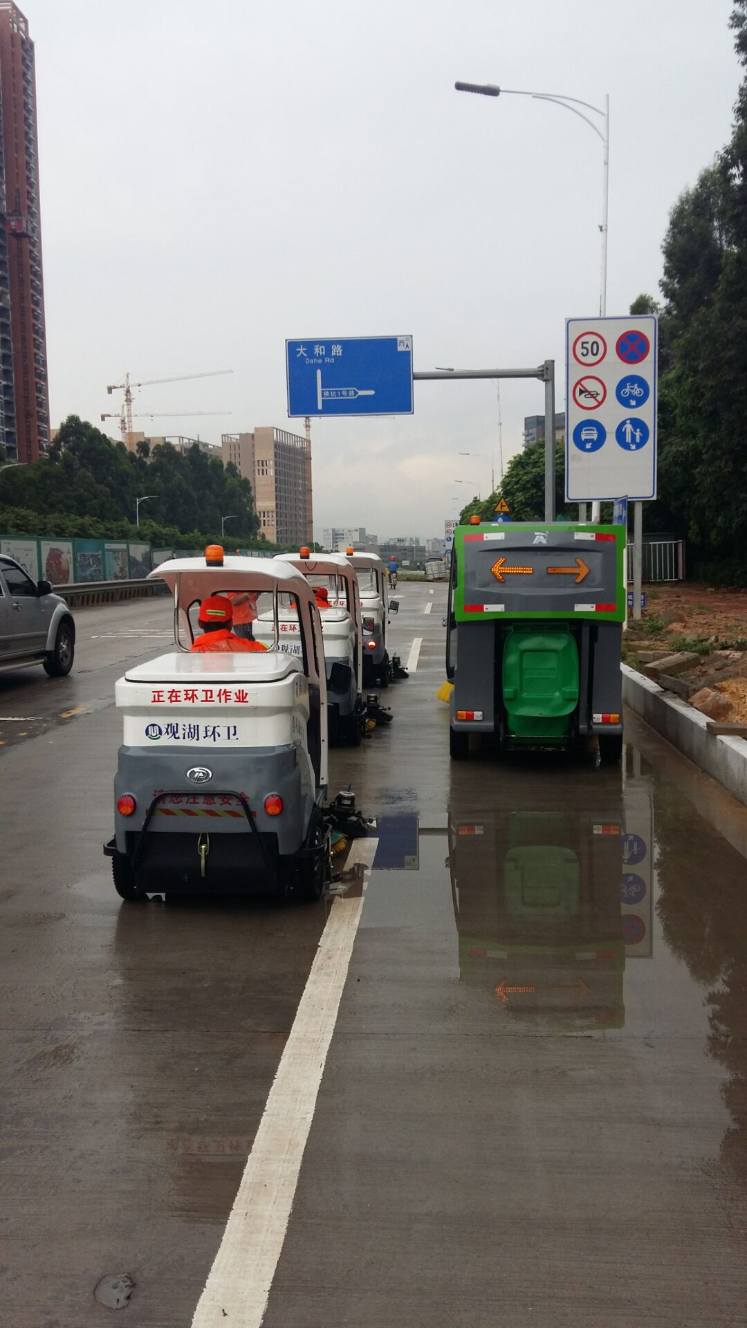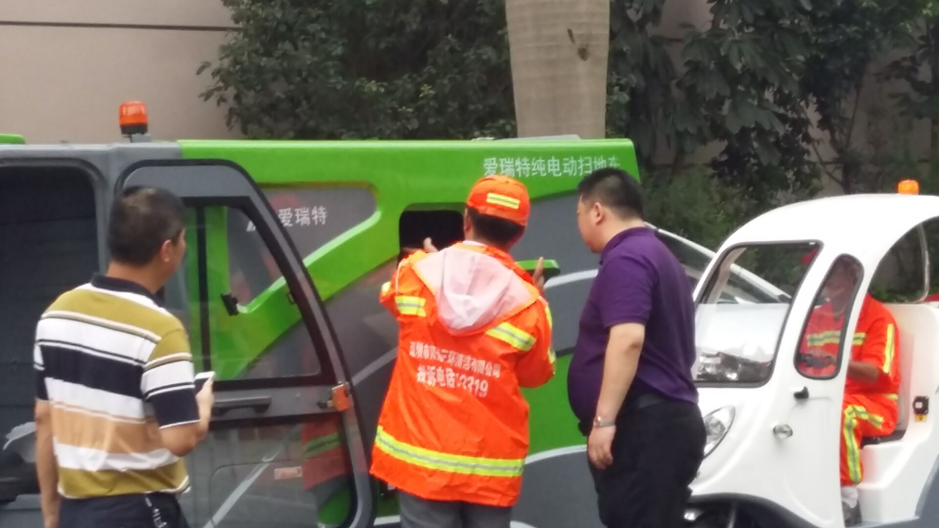 愛瑞特及龍華辦事處工作人員接到通知后,準備了一場特別的歡迎儀式。到達調研現(xiàn)場,迎面看到的是“愛瑞特儀仗隊”整齊劃一地停在馬路邊,等待領導的視察檢閱,成為觀湖街道上一道特別的風景線。龍華新區(qū)辦事處工作人員向相關領導系統(tǒng)詳細地匯報了環(huán)衛(wèi)項目的進展和后續(xù)規(guī)劃,并讓環(huán)衛(wèi)工作人員現(xiàn)場演示清掃過程。