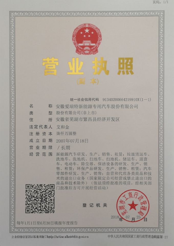 為滿足公司業務發展的需要,經蕪湖市工商局核準,依據《中華人民共和國公司法》的相關規定,原“安徽愛瑞特環保科技股份有限公司”已正式改名為“安徽愛瑞特新能源專用汽車股份有限公司”!屆時,愛瑞特將以嶄新的面貌進軍新能源環衛專用汽車行業,為實現新能源環衛專用汽車的快速發展貢獻力量。